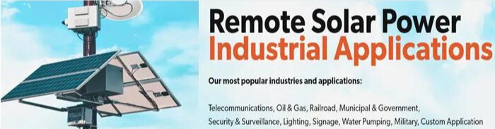 Our expertise extends to remote solar power applications for various industries, including: Telecommunications, Oil & Gas, Railroad, Municipal & Government, Security & Surveillance, Lighting, Signage, Water Pumping, Military, Custom Application.